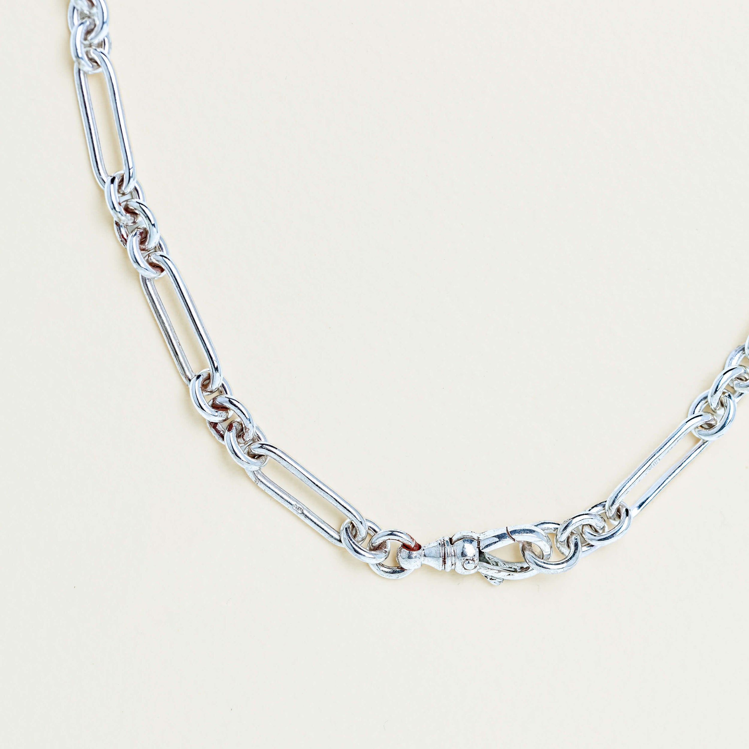 This sterling silver paperclip link fob chain blends timeless elegance with contemporary style, featuring elongated links and a sleek fob. Its polished silhouette adds a touch of sophistication, making it an essential accessory for any modern jewellery collection.