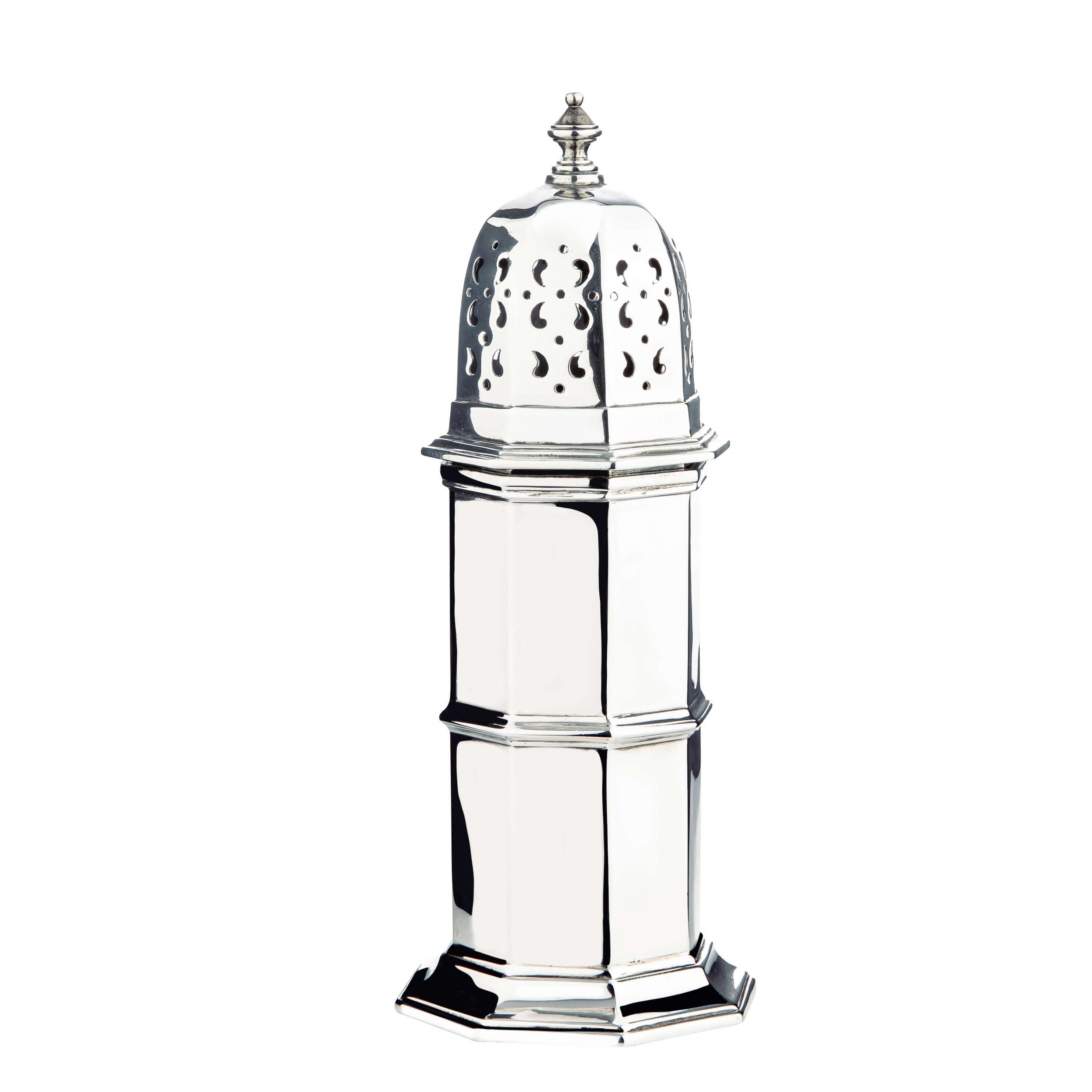 This sterling silver sugar castor is designed in a lighthouse form with a pierced lid and finished with a silver finial. It is hallmarked with Sheffield 1937, with the maker’s mark of William Hutton & Sons Ltd.