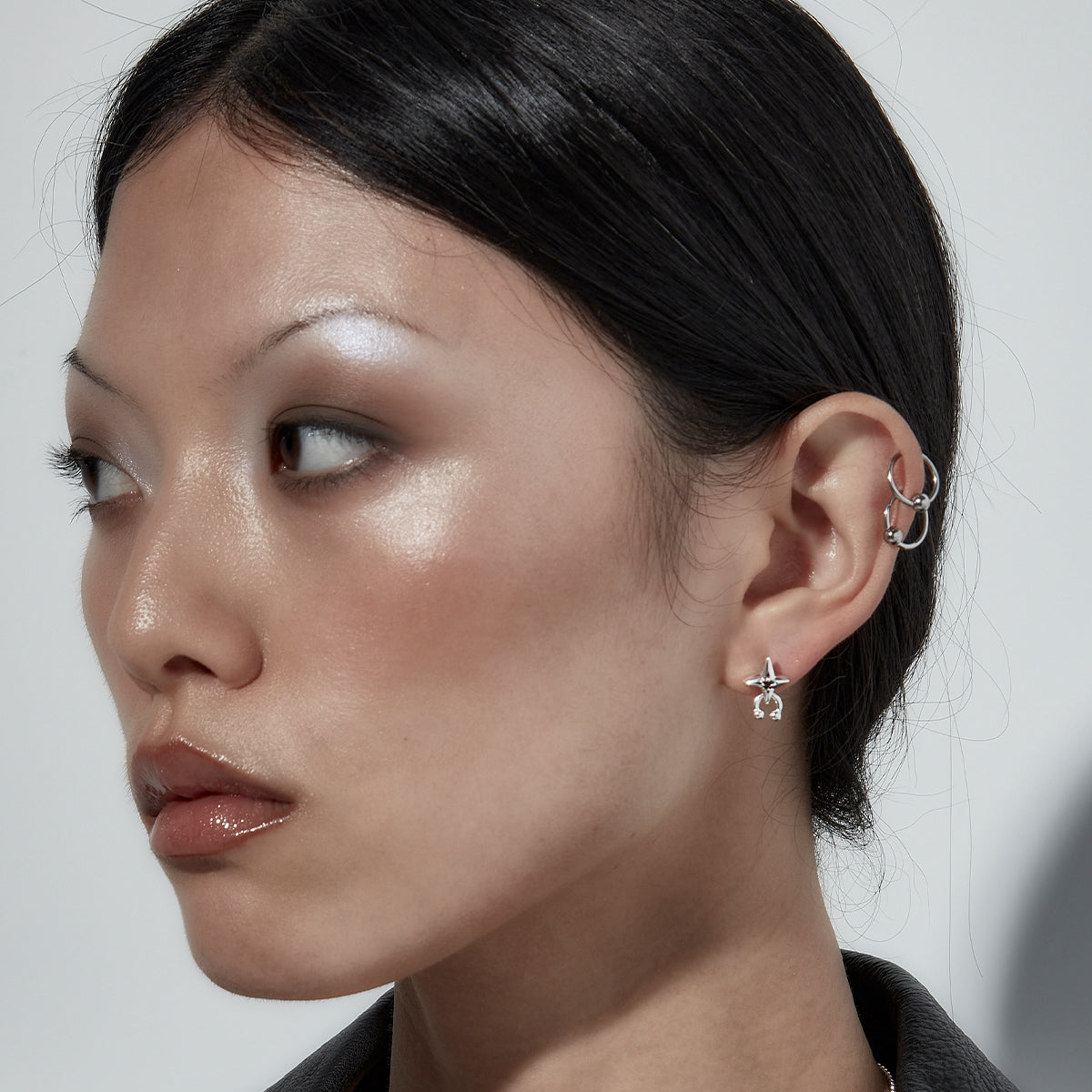 Male model wearing Stolen Girlfriends Club earring and ring