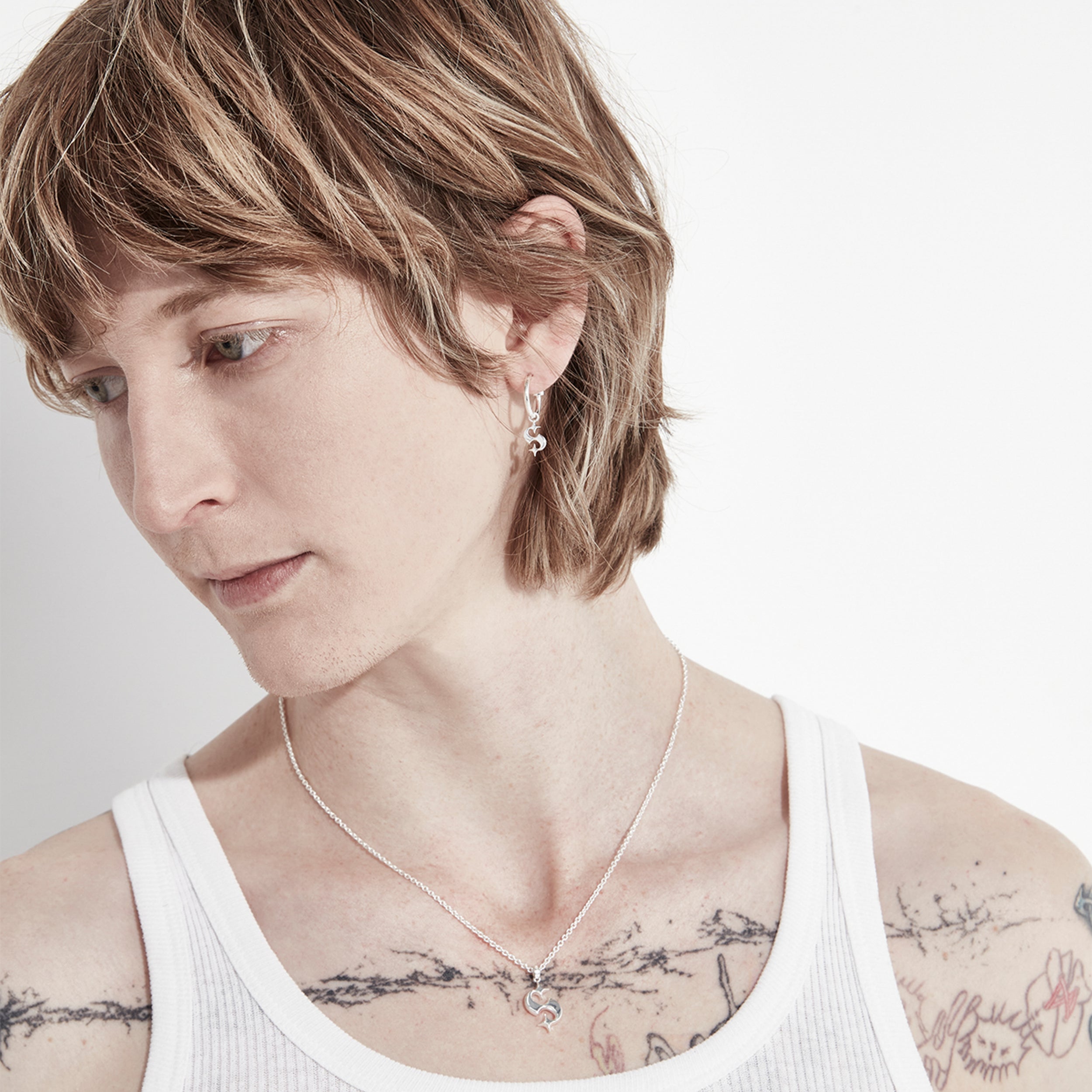 The Hidden Hearts Necklace by Stolen Girlfriends Club may at first appear to form the letter S, but a closer look reveals their intricate symbolism—two stars and two hearts mirrored within the design. One heart is given, the other stolen, representing the entwined forces of love and fate. Crafted from solid sterling silver.