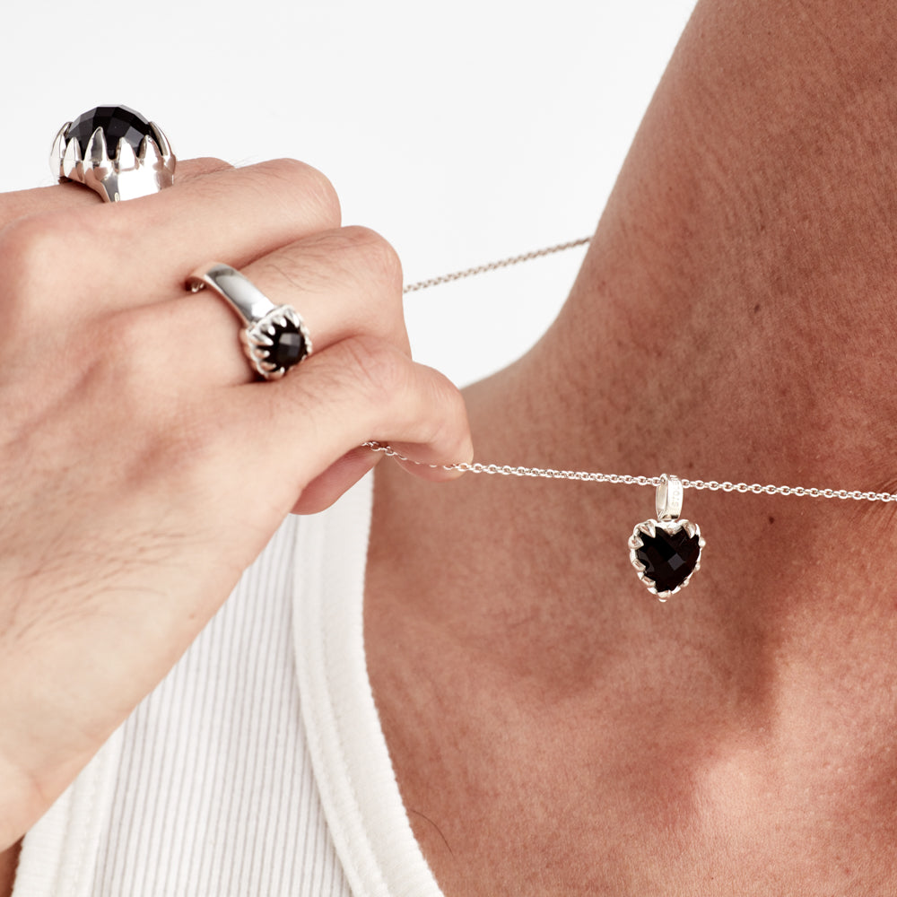 The bold onyx gemstone helps to defend against negativity, has protective energies and fortifies self confidence. Crafted in sterling silver.