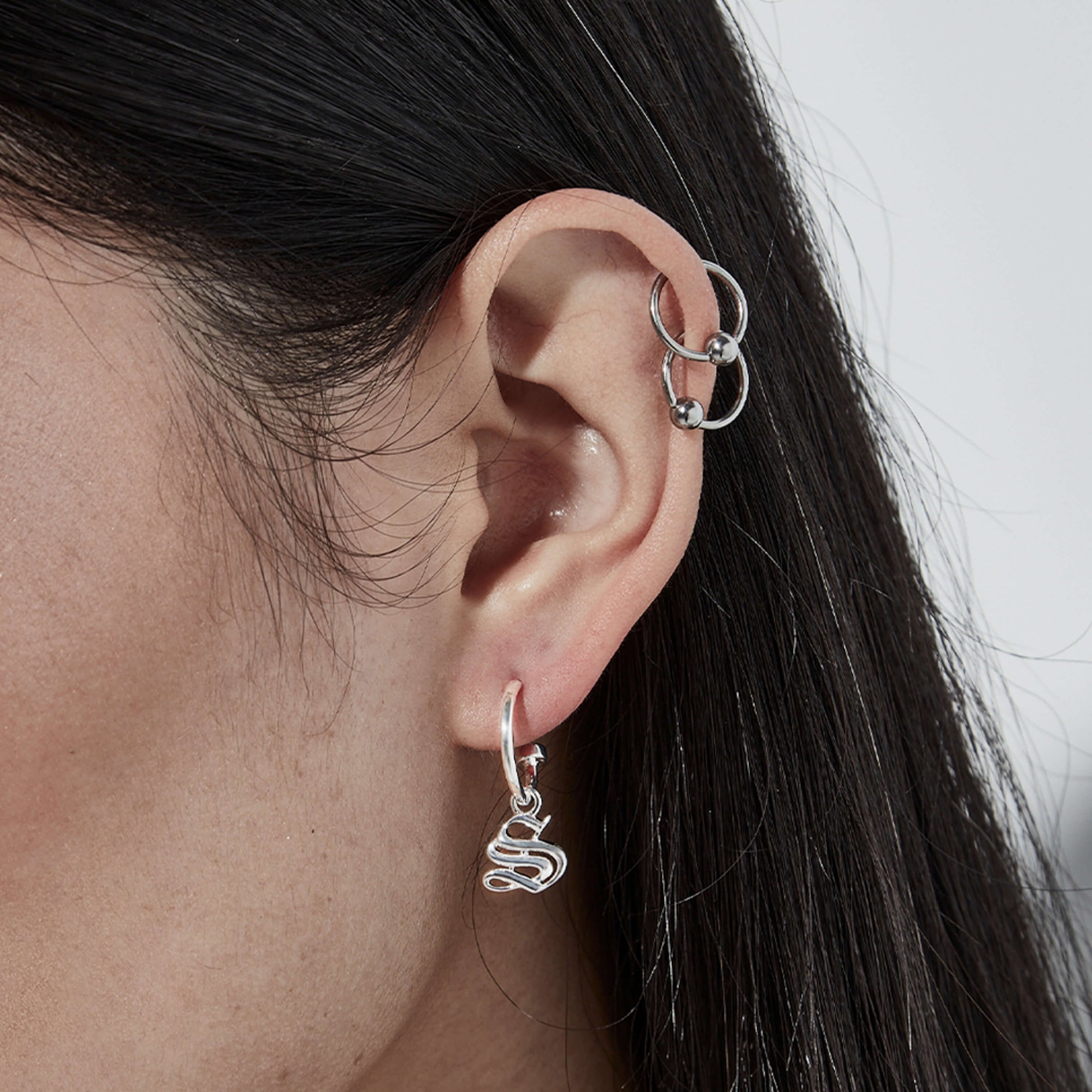 Stolen Girlfriends Club’s Anchor Sleepers are cast from solid sterling silver and finished with a high-polish shine. The sculptural “S” charms, rendered in Old English script, offer a subtle yet distinctive signature — an elegant accent for both every day and elevated looks.