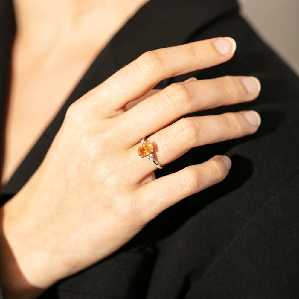 This stunning ring features one oval faceted golden-orange sapphire set inside a cluster of diamonds resting on a 18ct white gold mount.