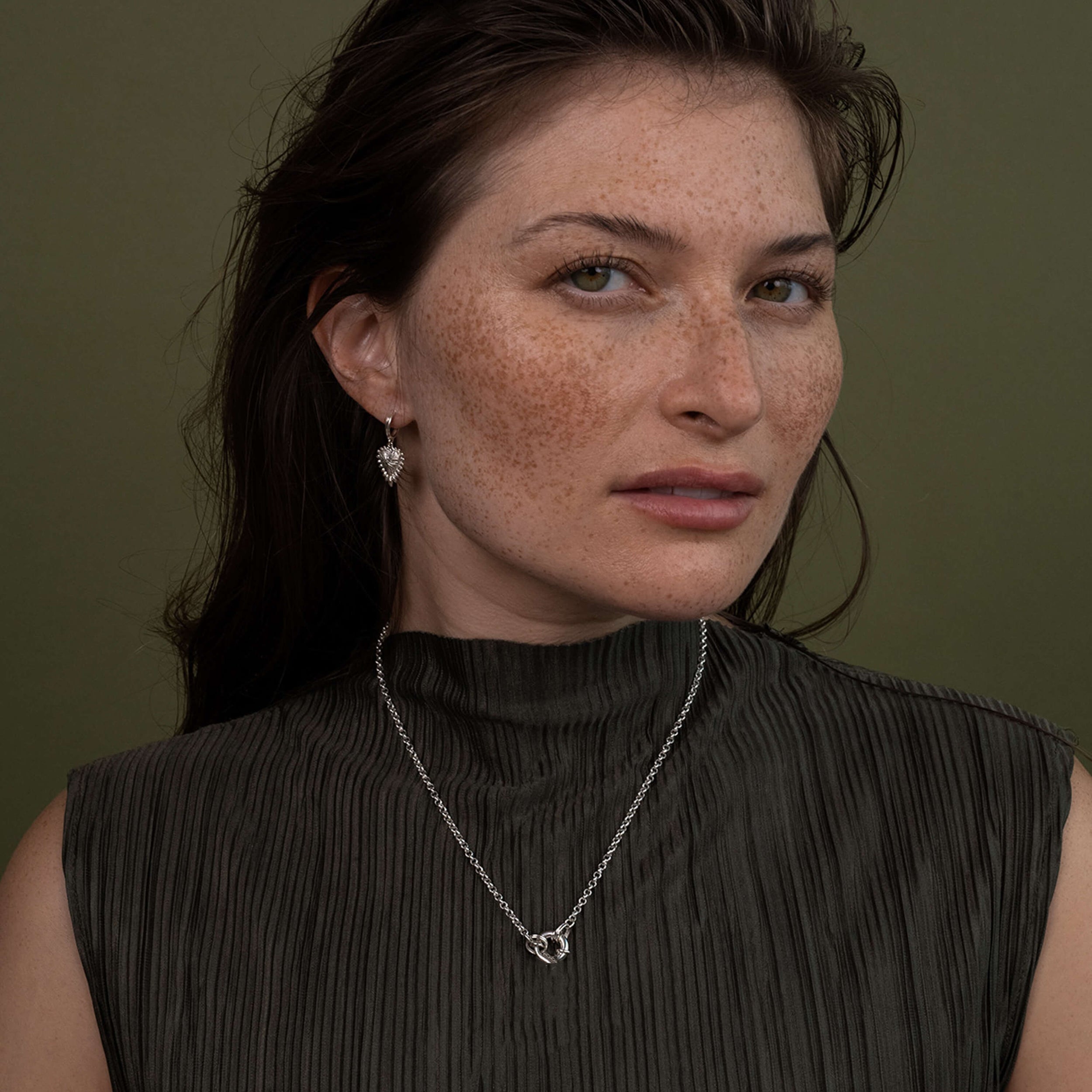 Model wearing Gypsy Heart Earrings and Sunburst Pendant