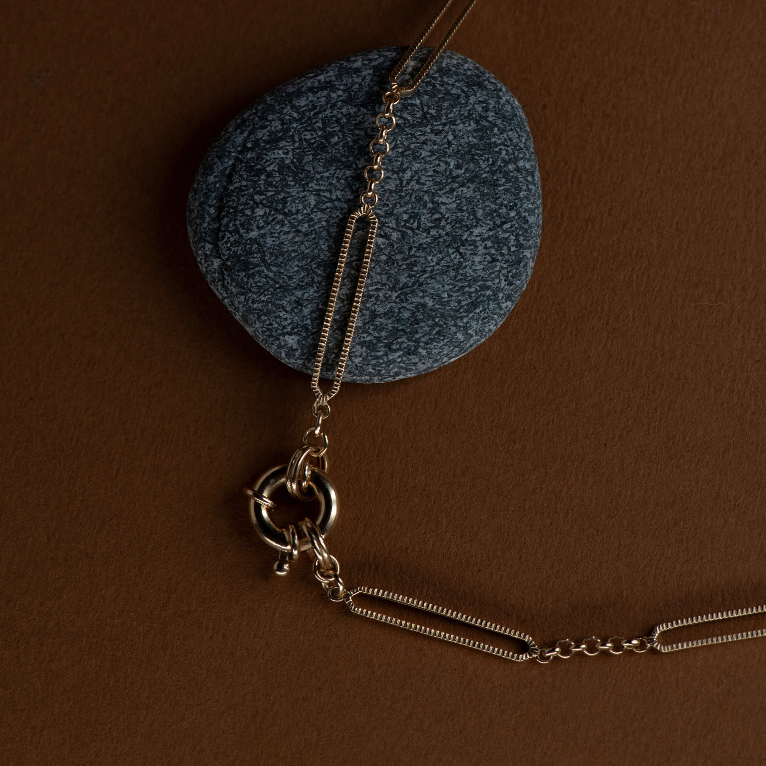 The Shanti Chain, at 40cm, sits delicately on the collarbone. With its distinctive bolt clasp that also functions as a stylish charm holder, this chain offers versatility. Wear it